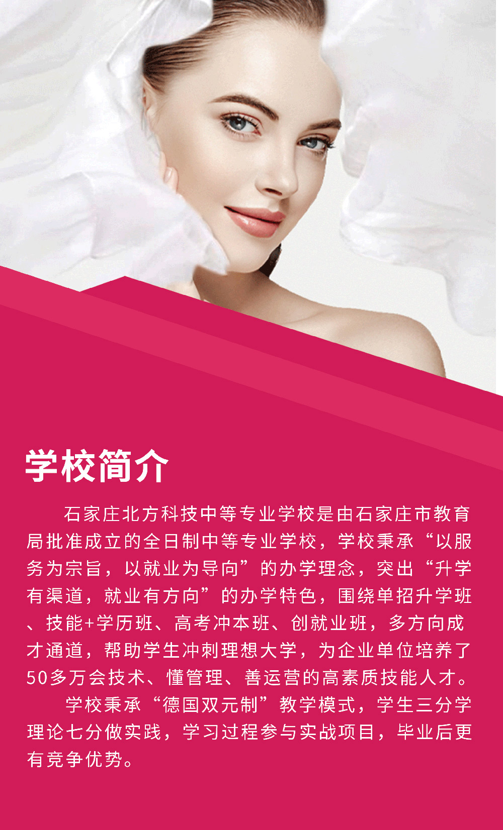 石家庄北方科技中专学校形象设计专业招生报名进行中。 形象设计专业包含美妆,造型,美容美体,医美,美甲,美睫,礼仪美学等课程,致力于打造全能型美业人才!