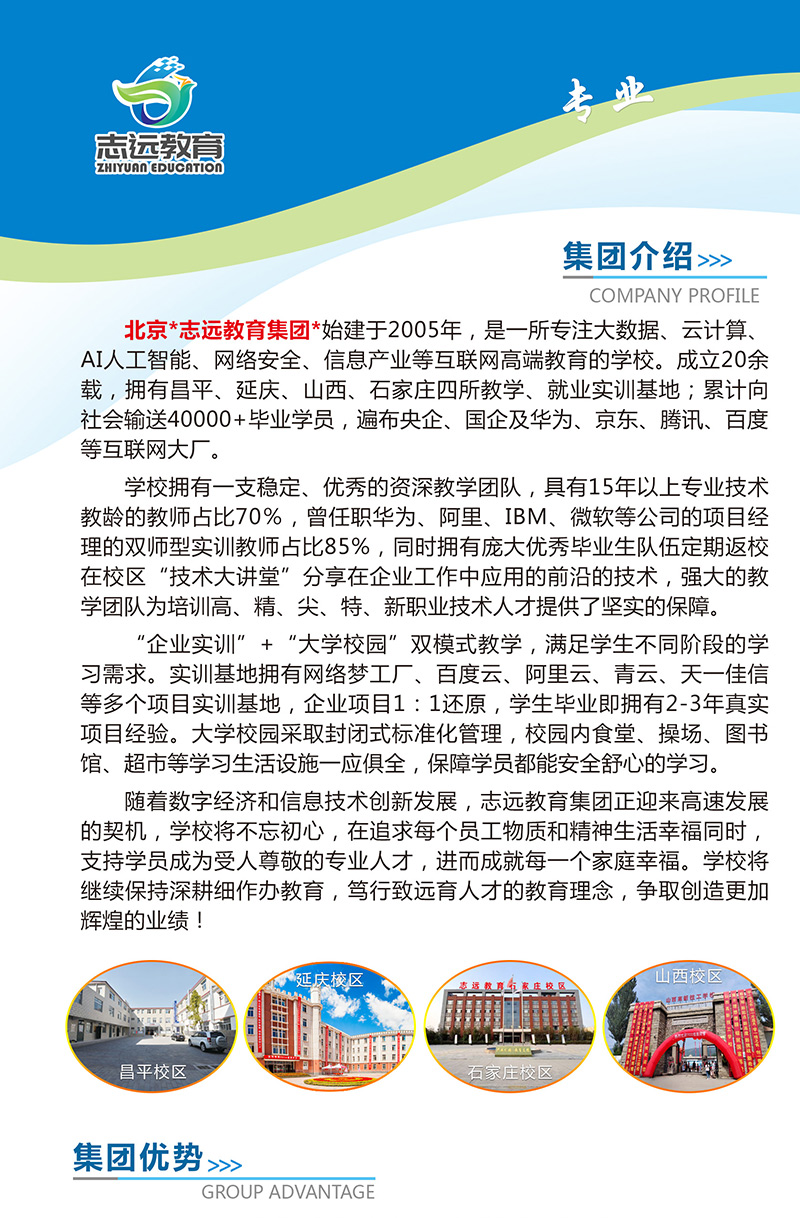 石家庄志远教育,招生对象:15周岁以上,初中毕业生,单招落榜生,高中毕业生,大学生特色专业:网络工程师、 UI设计师、大数据工程师、人工智能、AI软件工程师、W E B前端工程师、云计算工程师。