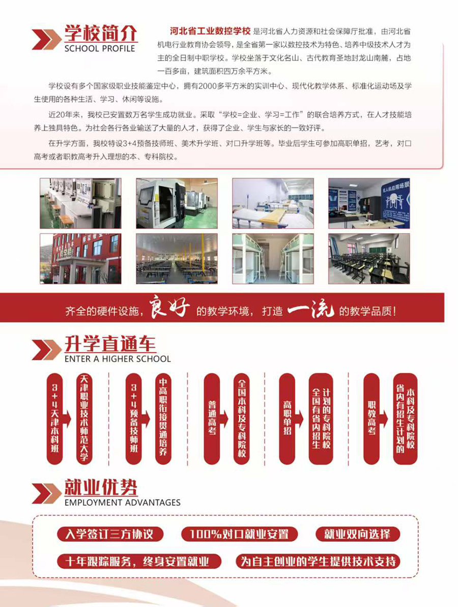 河北省工业数控学校是由河北省机电行业教育协会领导,是全省第一家以数控技术为特色、培养中级技术人才为主、兼有高级技工教育的全日制中职学校。 学校设有多个国家级职业技能鉴定中心,拥有2000多平方米的实训中心。