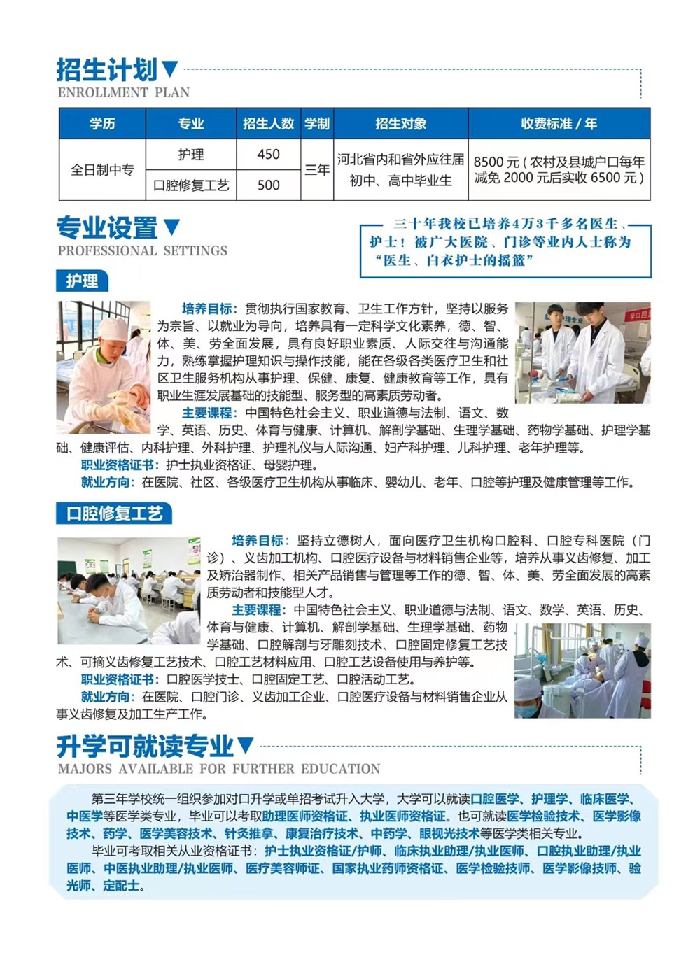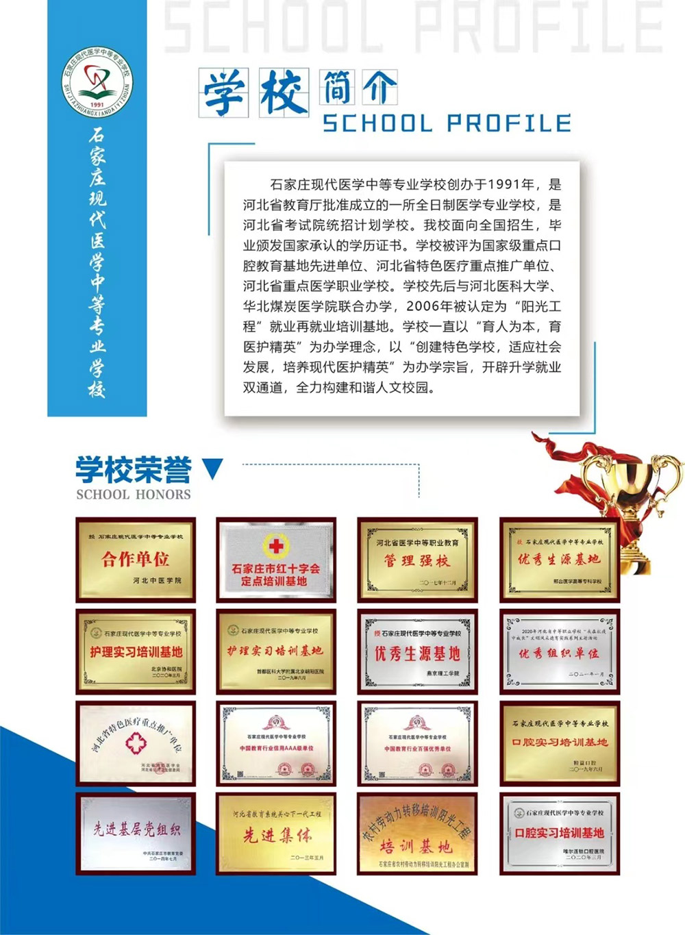 石家庄现代医学中等专业学校创办于1991年,是河北省教育厅批准成立的一所全日制医学专业学校,是河北省考试院统招计划学校。我校面向全国招生,毕业颁发国家承认的学历证书。学校被评为国家级重点口腔教育基地先进单位、河北省特色医疗重点推广单位河北省重点医学职业学校。学校先后与河北医科大学、华北煤炭医学院联合办学,2006年被认定为“阳光工程”就业再就业培训基地。