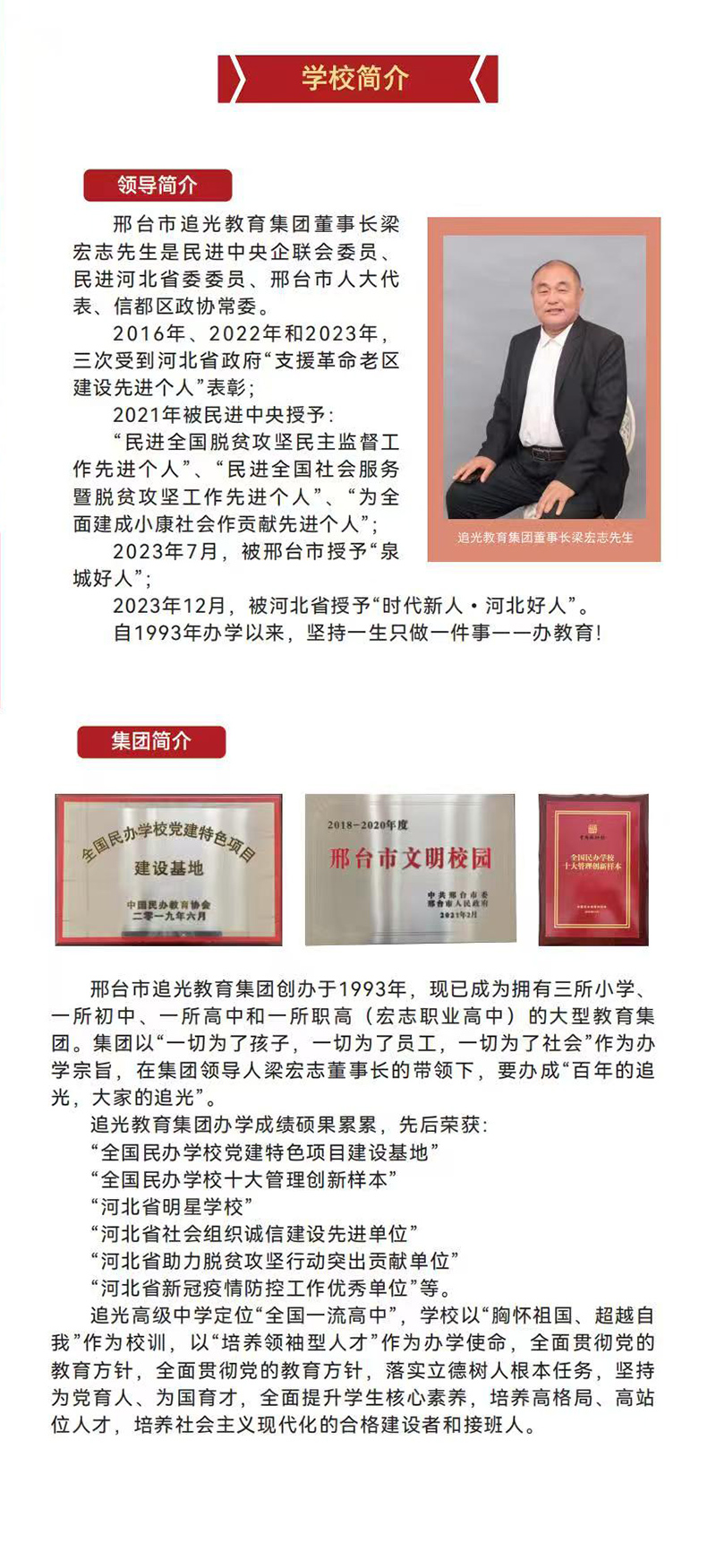 邢台市追光高级中学位于邢台市襄都区风景如画的七里河北岸,是民进河北省委委员、邢台市人大代表、民进中央全国脱贫攻坚民主监督工作先进个人、邢台市追光教育集团董事长梁宏志先生带领集团精心打造的,在邢台市委、市政府、市教育局、市审批局、襄都区区委、区政府、区教育局大力支持下,按照省级示范性高中打造的私立高级中学。学校奉行“以学生为中心,以奋斗者为本”的价值观。